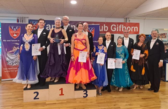 Doppelerfolg in Gifhorn Ein tolles Ergebnis brachte unser Turnierpaar Michaela und Frank Emmelmann (MAS III B Standard) von den GIFTATA (Gifhorner Tanz Tage) mit. An beiden Tagen konnten sie durch sehr gute Leistungen überzeugen und ihr Turnier jeweils deutlich gewinnen. Mit 5 (von 5) gewonnenen Tänzen am ersten Tag und 3 gewonnenen Tänzen am zweiten Tag (davon 2x der zweite Platz) lagen sie klar vorn und konnten dadurch neben 11 Aufstiegspunkten auch 2 Platzierungen verbuchen. Somit ist ein großer Schritt in Richtung nächsthöhere Klasse (MAS III A) getan.